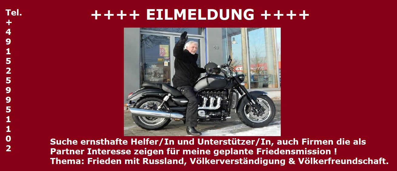 Es gibt vieles was ich über Russland berichten könnte, jedoch werde ich das gerne live tun, wenn ich auf meiner Friedensfahrt mit dem Motorrad in Russland bin.