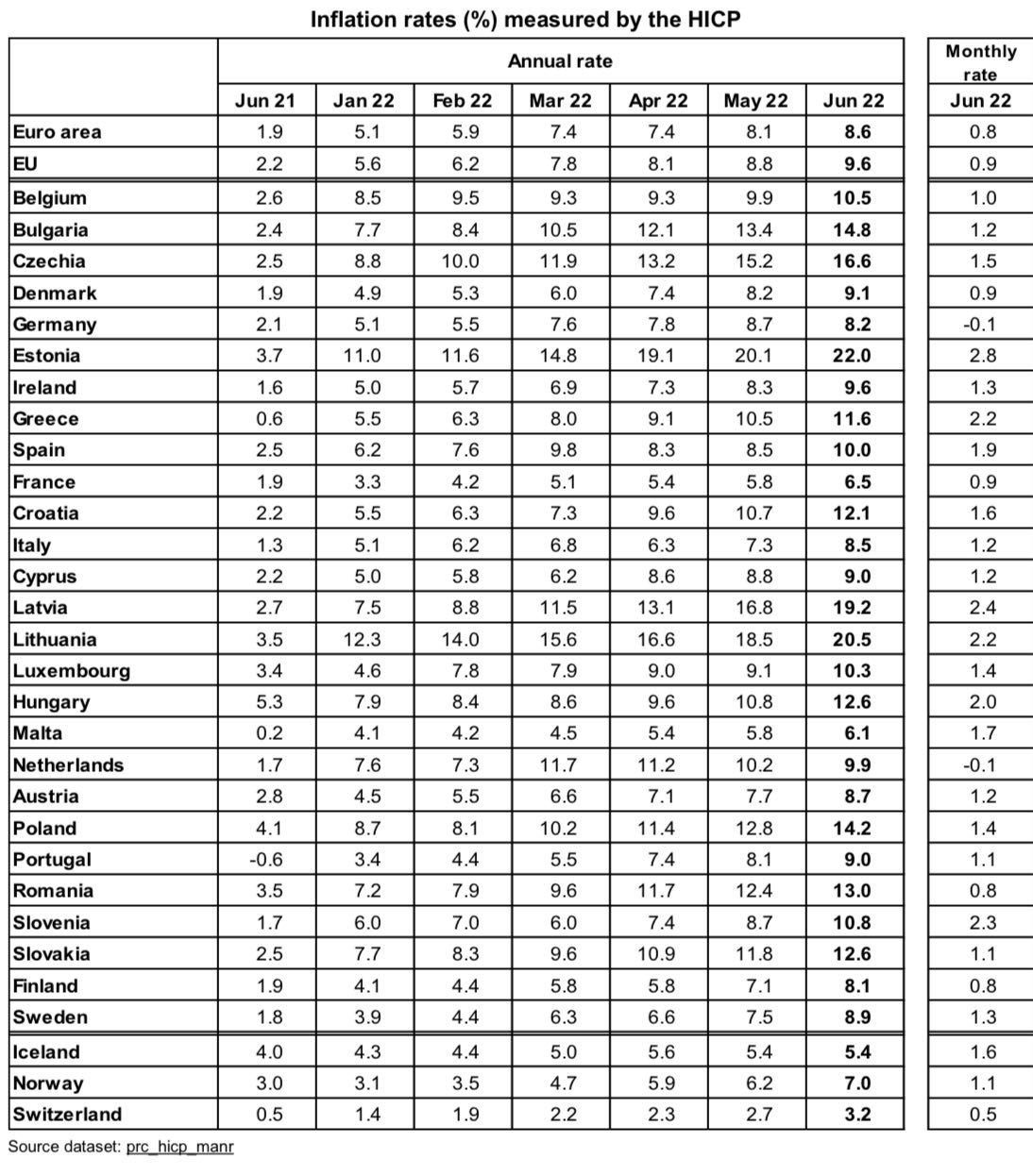 ▪️In 15 EU-Ländern lag die Inflation im zweistelligen Bereich (10 % oder mehr). Höchste Inflation in Estland +22%, Litauen +20,5%, Lettland +19,2%